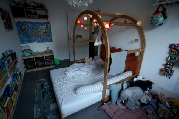 Im Kinderzimmer befindet sich neben Regalen für Spiele und Bücher ein schönes Bodenbett, welches entweder mit einer Matratze für ein Kinder genutzt werden kann oder ausgezogen mit zwei Matratzen ein schönes Doppelbett für zwei Kinder ergibt.