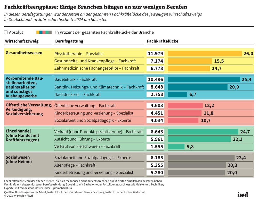 Der Fachkräftemangel trifft aber längst nicht nur typische Engpassbranchen. Auch der Einzelhandel, das Sozialwesen und große Teile der Industrie melden strukturelle Lücken – oft ebenfalls konzentriert auf wenige zentrale Berufe. Im Sozialwesen entfallen bereits rund 80 Prozent der Fachkräftelücke auf vier Funktionen, was die Abhängigkeit sozialer Infrastruktur von einzelnen Qualifikationen verdeutlicht.